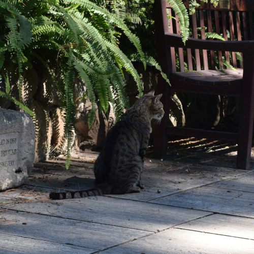 A cat in a cemetery in Rome. He approached me to get some strokes and kept sniffing around my stuff. Since it was another hot summer day, I assumed he might be thirsty, so I got my water bottle out and poured water into my hand.